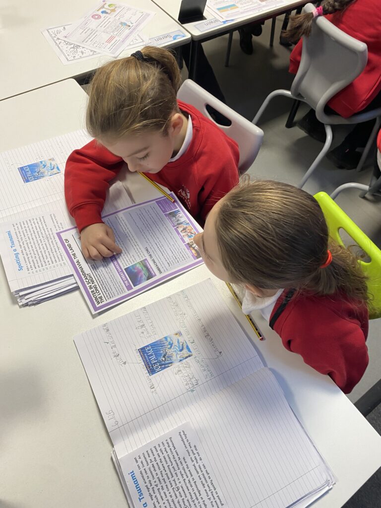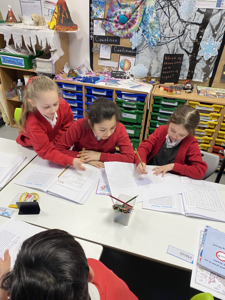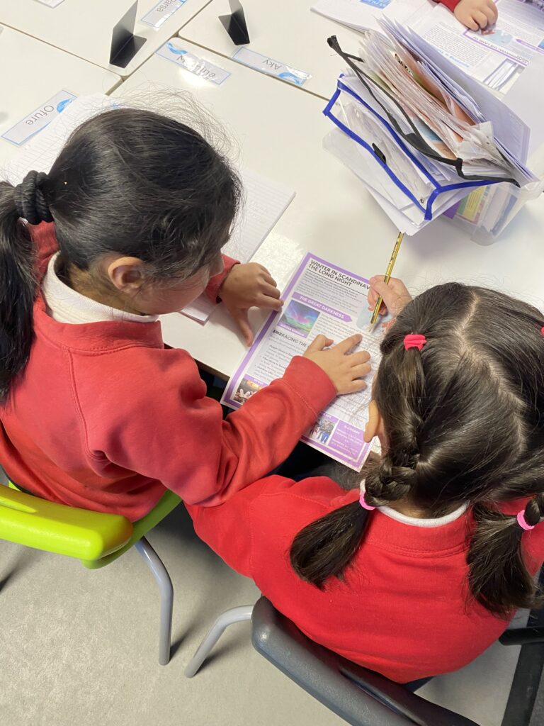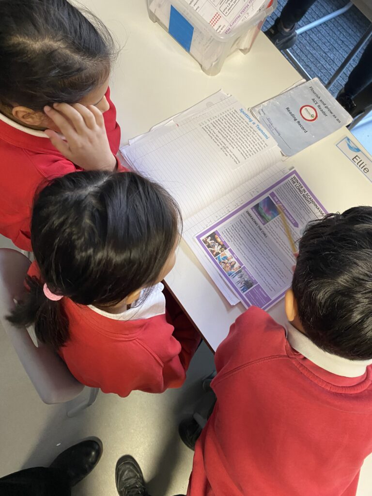 They have been enjoying working in pairs across all aspects of their learning. The pictures show them working together in reading to discuss the answer to questions, exploring the text in more depth and inferring meaning from what they have read.